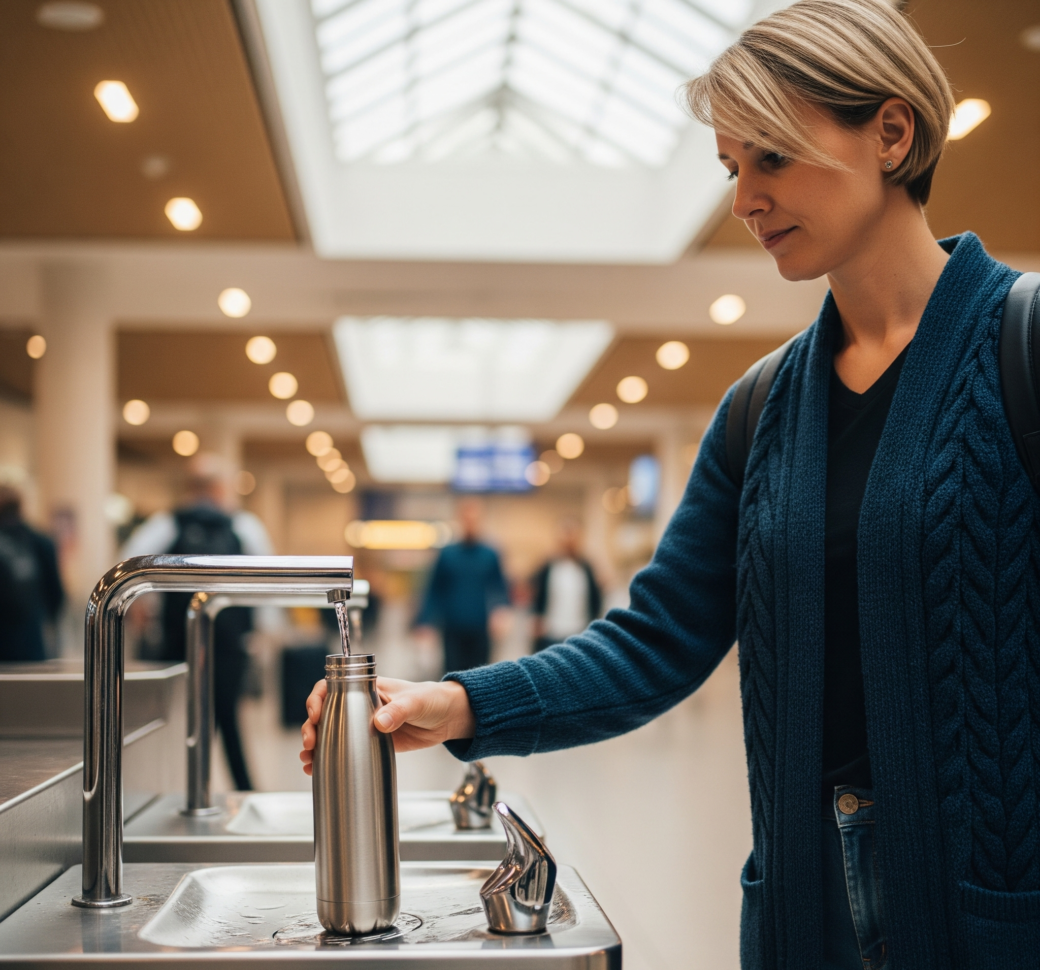 Bring an empty water bottle and fill it up after security. Most airports have fountains or refill stations near the gates. It’s cheaper than buying bottled water, and you’ll feel way better when you land.