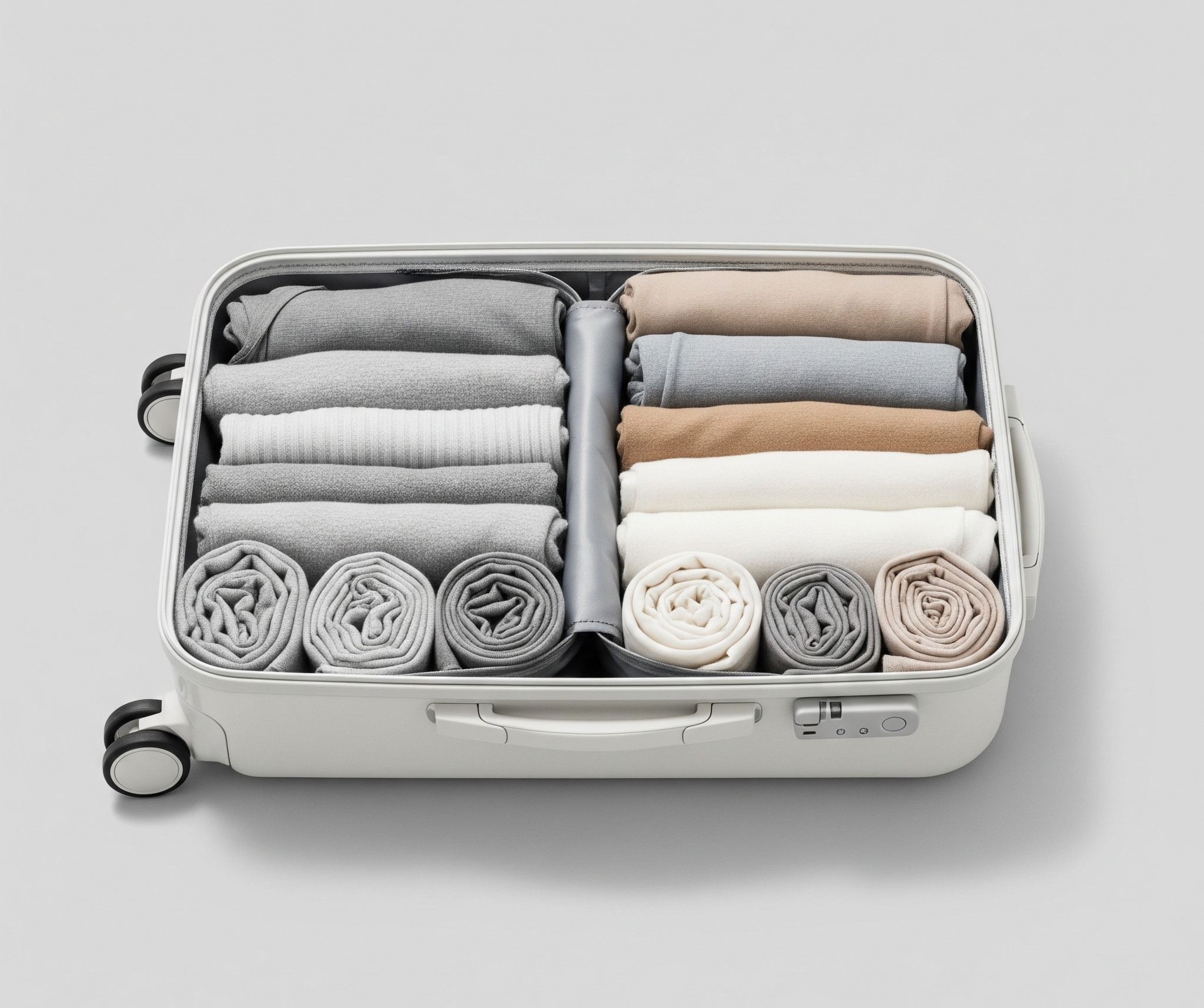 Choose clothes in neutral colors so you can mix and match. And here’s a packing trick that actually works: roll your clothes instead of folding them. It saves space, and they come out less wrinkled.